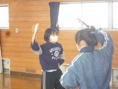 5年生が6年生から、「基本の姿勢」や「足の運び」「手の動き」さらには「鈴や扇の使い方」を学
